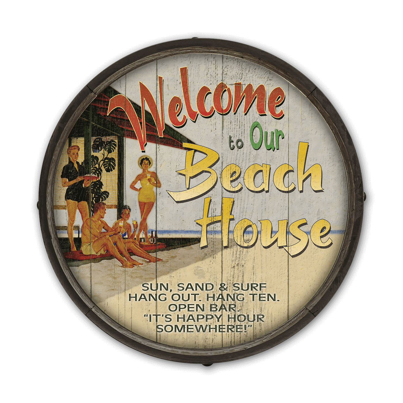 Handcrafted from solid wood and shaped to resemble the curved end of a wine or rum barrel, this round wall sign recalls the days when beach houses were as much about community as they were about comfort. The artwork — rendered in a weathered, vintage style — features a lively mid-century beach scene: sunbathers relaxing in golden light, a breezy cabana open to the ocean, and the joyful invitation of painted lettering that reads “Welcome to Our Beach House.”