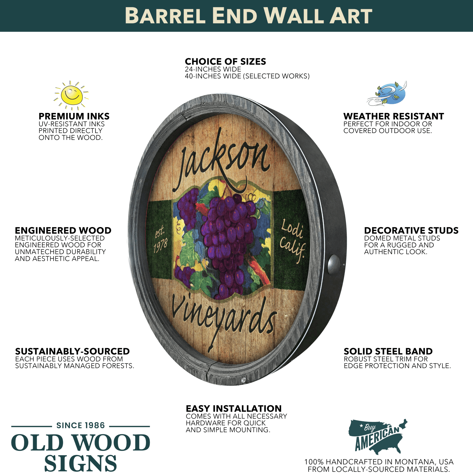 The sturdy frame, modeled after an actual barrel rim, adds architectural depth and authenticity. Its subtle curvature, achieved through traditional woodworking methods, gives the sign a sculptural presence — a perfect blend of rustic craftsmanship and seaside whimsy. Like the handmade barrel-end signs once seen in coastal taverns and surf shacks, it’s designed to evoke warmth, laughter, and long, lazy afternoons.