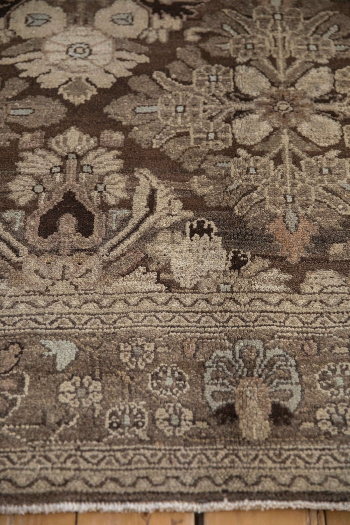 The carpet’s palette tells a quieter story, one of natural light and age-softened tones: chocolate brown, platinum, oxidized silver, and ivory flow together in a warm, smoky gradient. Gentle abrash striations — subtle shifts in color resulting from the use of small-batch vegetable dyes — lend an organic depth and movement to the surface. Hints of dusty powder blue and olive green peek through the floral forms, adding whisper-soft dimension. The effect is at once grounding and ethereal — as though this Vintage Persian Bibikabad Carpet were painted in the fading light of dusk.