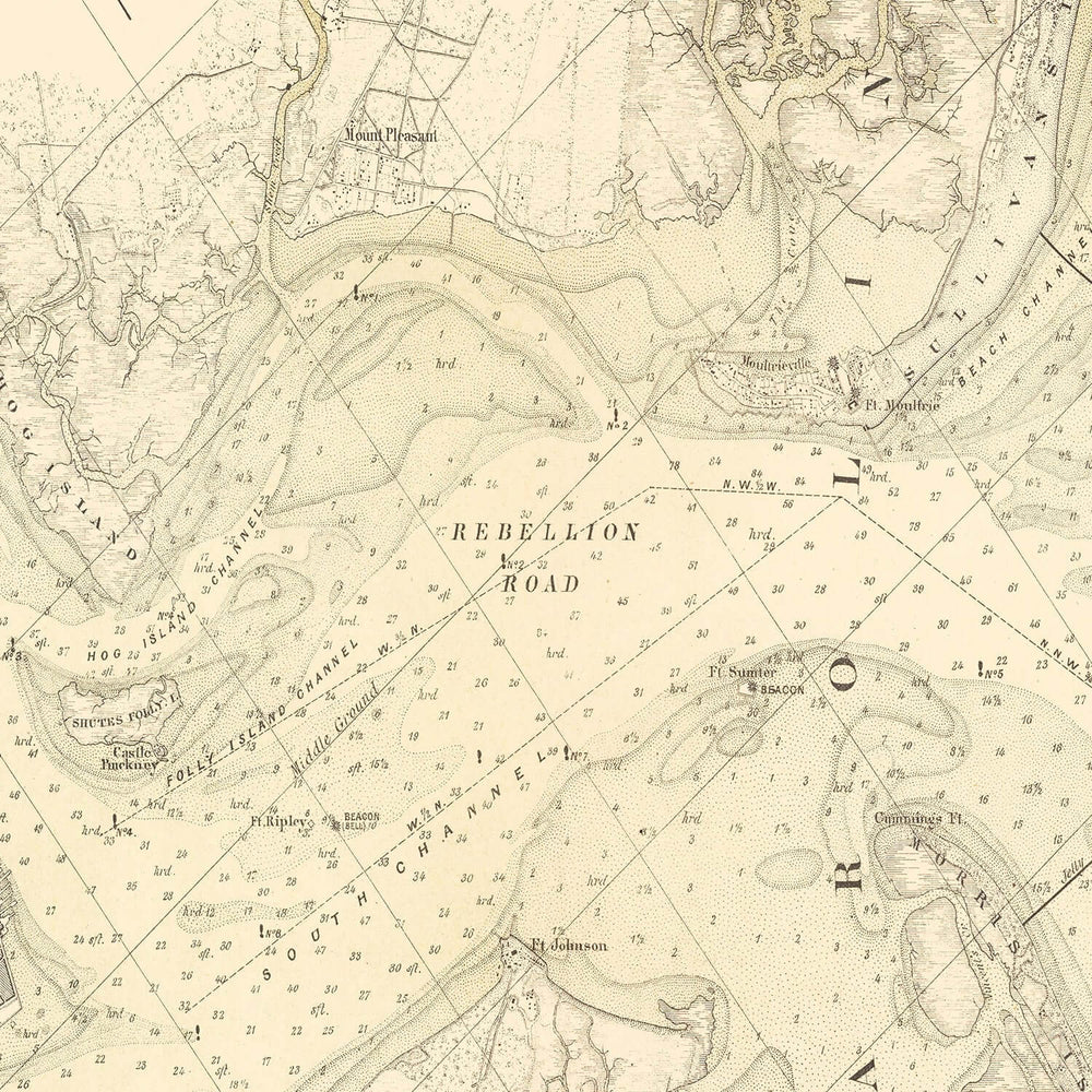 Beyond its visual appeal, this map serves as a meditation on Charleston’s storied past. In 1884, the city stood at the crossroads of recovery and renewal — rebuilding its maritime economy while preserving the grace and architectural beauty that still define it today. One can almost imagine the creak of wooden ships in the harbor, the soft hum of the tides, and the warm light filtering through the Spanish moss-draped oaks. The chart itself, originally created for navigation, offers not just direction but narrative — a window into the rhythms of trade, travel, and coastal life.