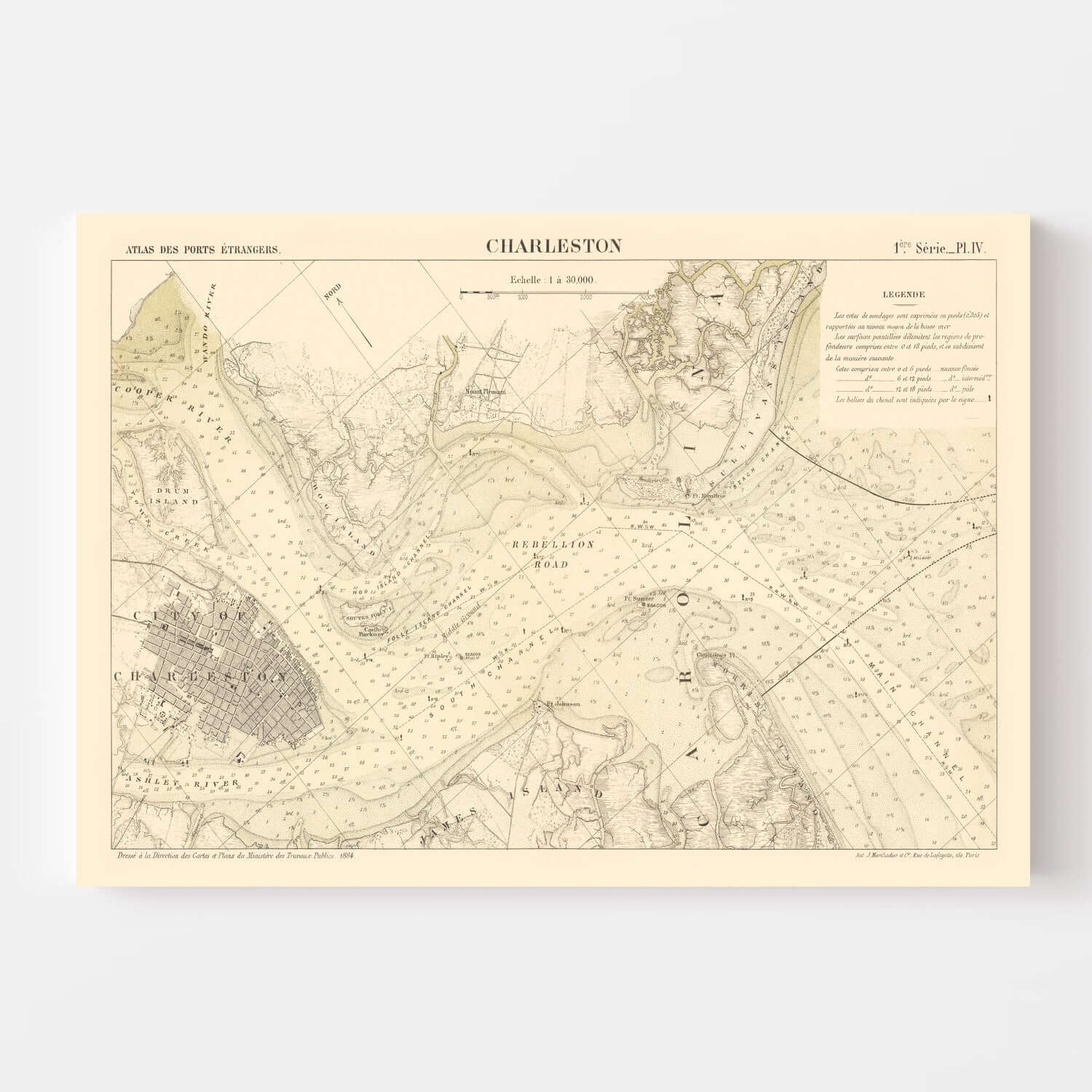 The Antique Map of Charleston, South Carolina from 1884 is an exquisite testament to the artistry of cartography and the quiet grandeur of one of America’s oldest cities. Originally published as part of a French maritime atlas, this finely detailed nautical chart captures the sweeping beauty of Charleston Harbor, its winding waterways, and the historic heart of the city itself. Every contour and coordinate speaks to the precision and elegance of 19th-century mapmaking — a perfect blend of artistry, science, and soul.