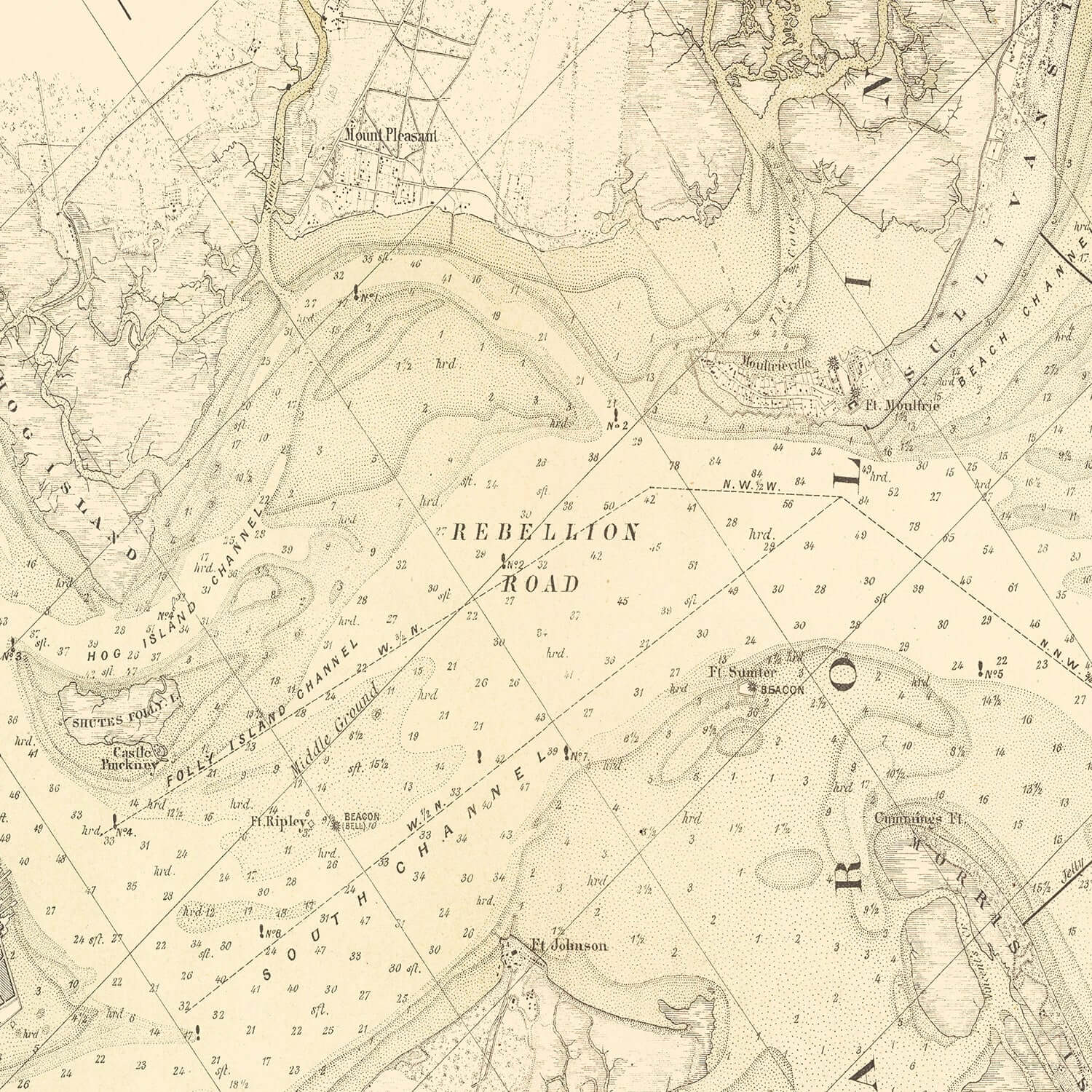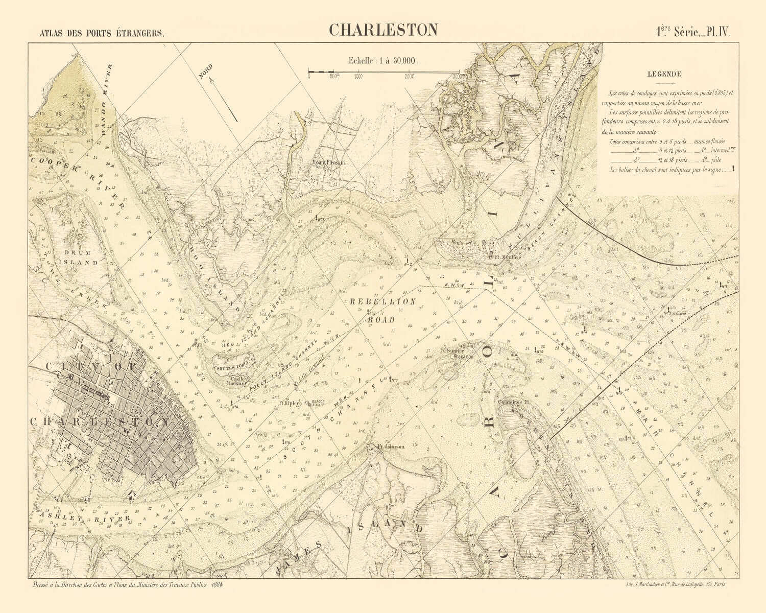 Faithful reproduction of an 1884 French nautical chart of Charleston Harbor