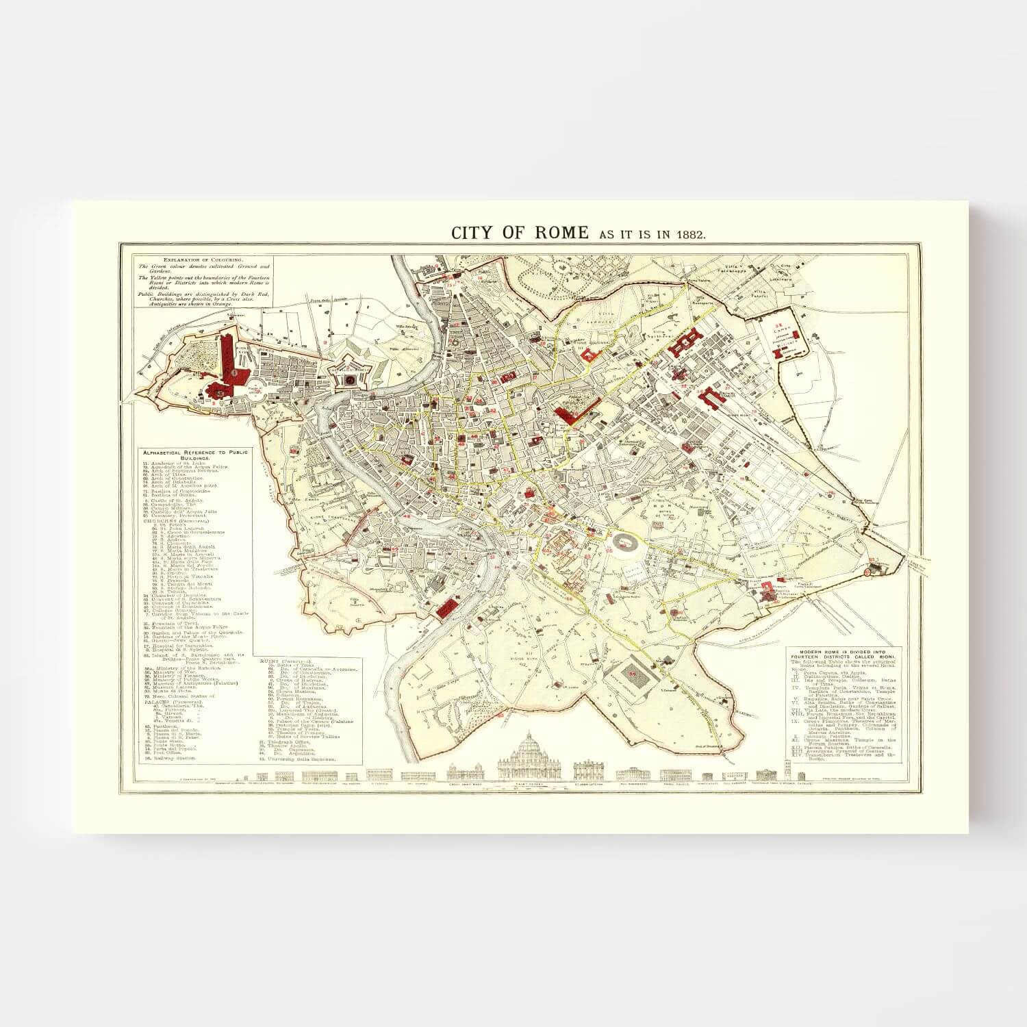 In the home, this Antique Map of Rome, Italy from 1883 exudes the refined poise of Vintage Glamour interiors — elegant, cultured, and eternally timeless. It brings an air of European sophistication to a drawing room, library, or study, and pairs effortlessly with dark woods, gilded frames, and natural linens. The finely engraved lettering, listing ancient ruins and papal sites, provides both scholarly intrigue and visual poetry. One can almost hear the distant murmur of fountains in the piazzas, the gentle rustle of cypress leaves, and the chime of church bells marking the Roman hours.