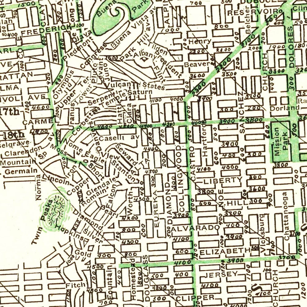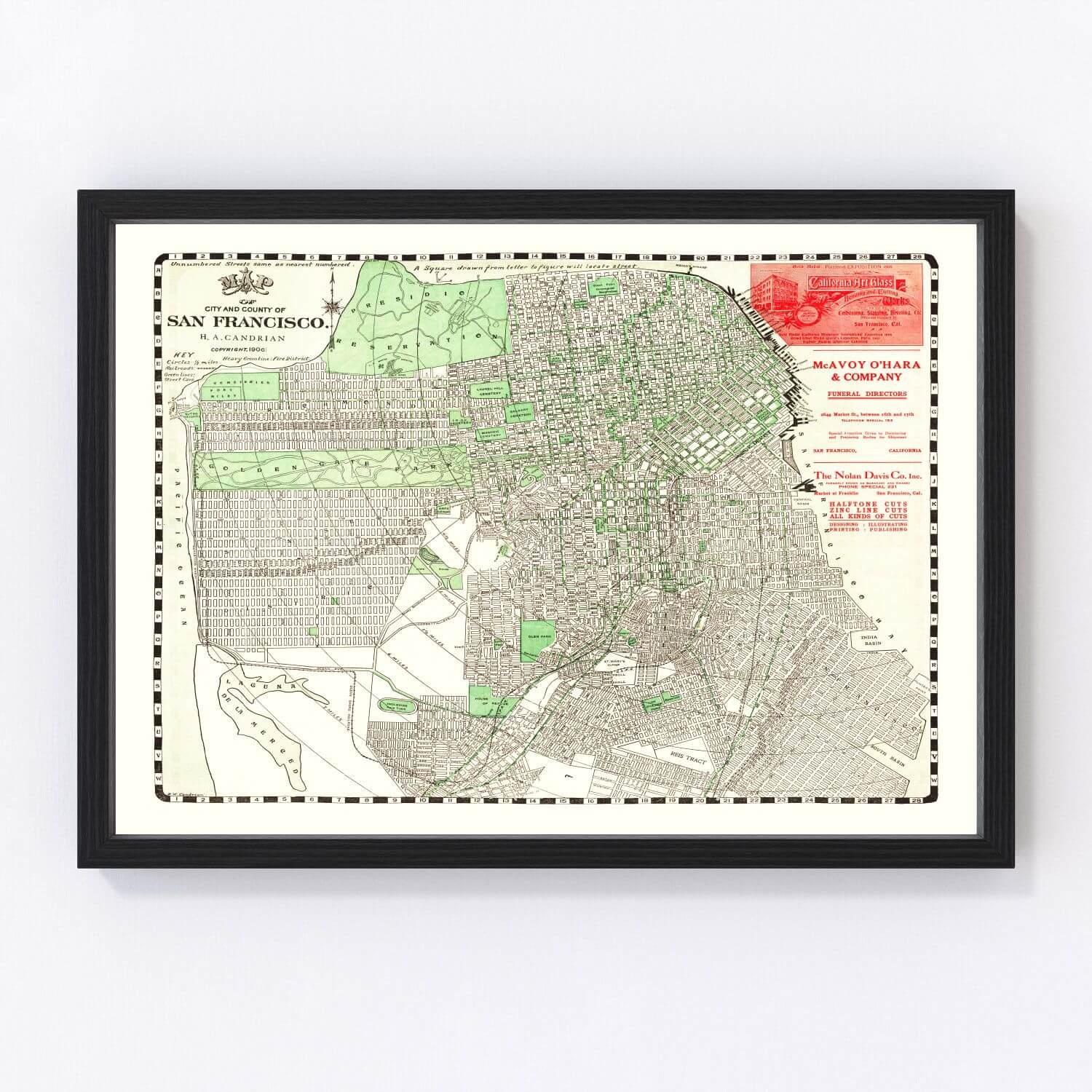 This beautifully restored reproduction reveals the intricate grid of streets, parks, and neighborhoods that characterized early 20th-century San Francisco. From the gentle sweep of Golden Gate Park to the tightly knit blocks of downtown and the steep inclines of Telegraph Hill, every detail tells the story of a metropolis on the rise. The map, with its soft parchment hues, vivid green parklands, and deep red typography, embodies both precision and poetry — a balance of cartographic utility and aesthetic grace.
