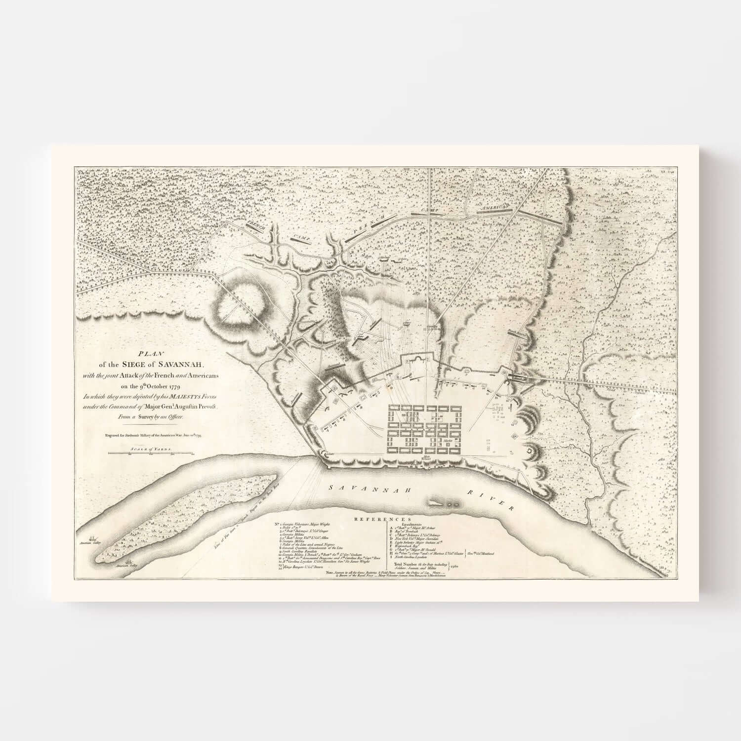 This vintage map, titled Plan of the Siege of Savannah, not only portrays the city’s early streets but also bears the traces of one of the defining moments in its history: the 1779 siege during the American Revolution. It is both a work of geography and a work of memory — charting the city’s fortified boundaries, the surrounding marshlands, and the slow, winding current of the Savannah River. The artistry lies in its dual nature: a technical military plan and a lyrical depiction of a place deeply rooted in the American story.