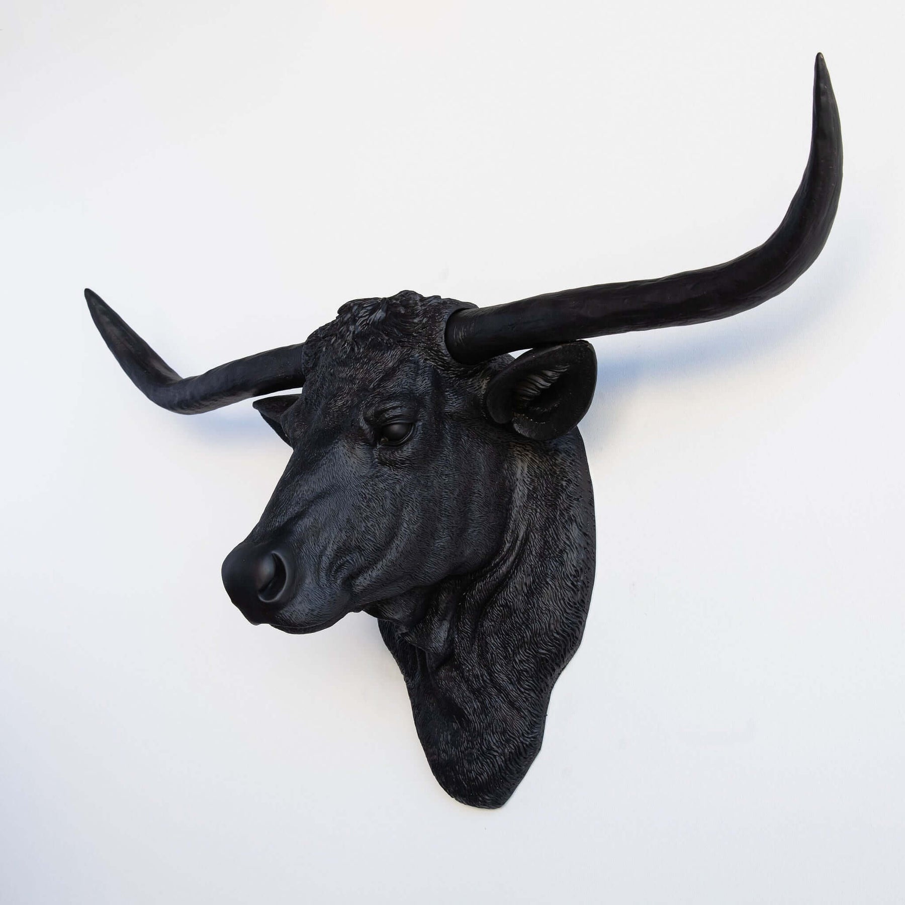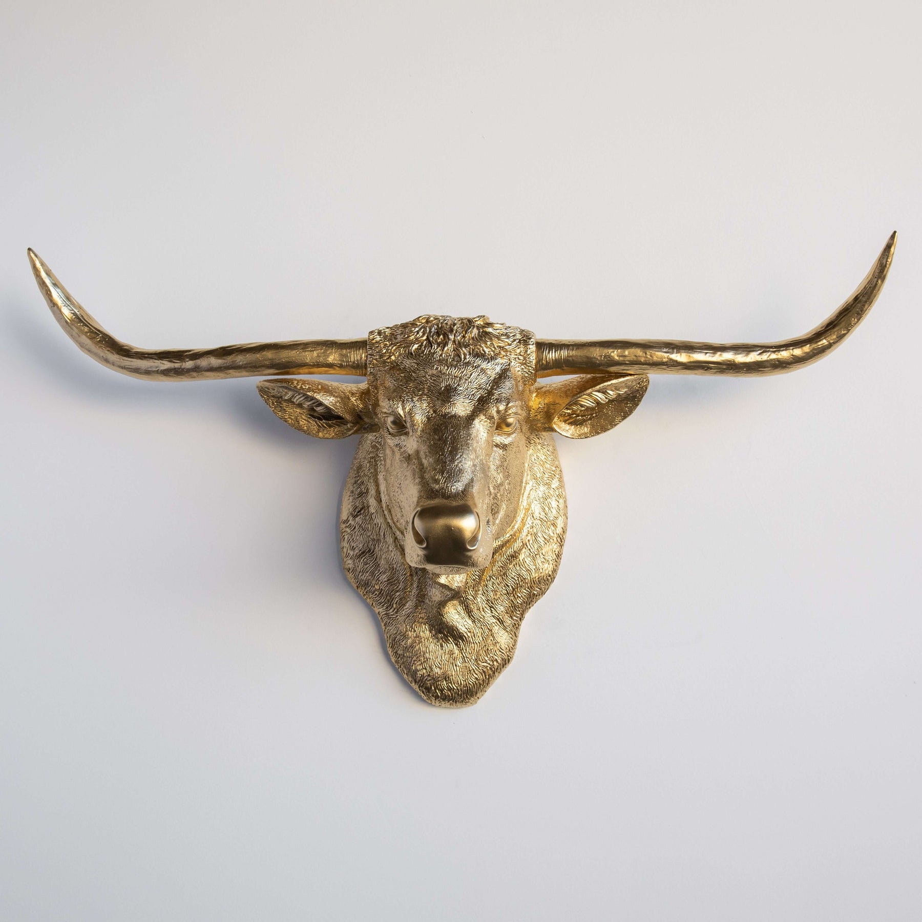 Handmade from cruelty-free resin, each sculpture is a study in form and balance — the powerful symmetry of the horns, the rugged texture of the hide, the quiet intelligence in the eyes. The piece is finished by hand with a deep matte black patina, contrasted by brilliant metallic gold horns that sweep outward in dramatic arc, spanning nearly three feet across. Together, they command the wall with a presence that feels both natural and sculptural, both classic and contemporary.