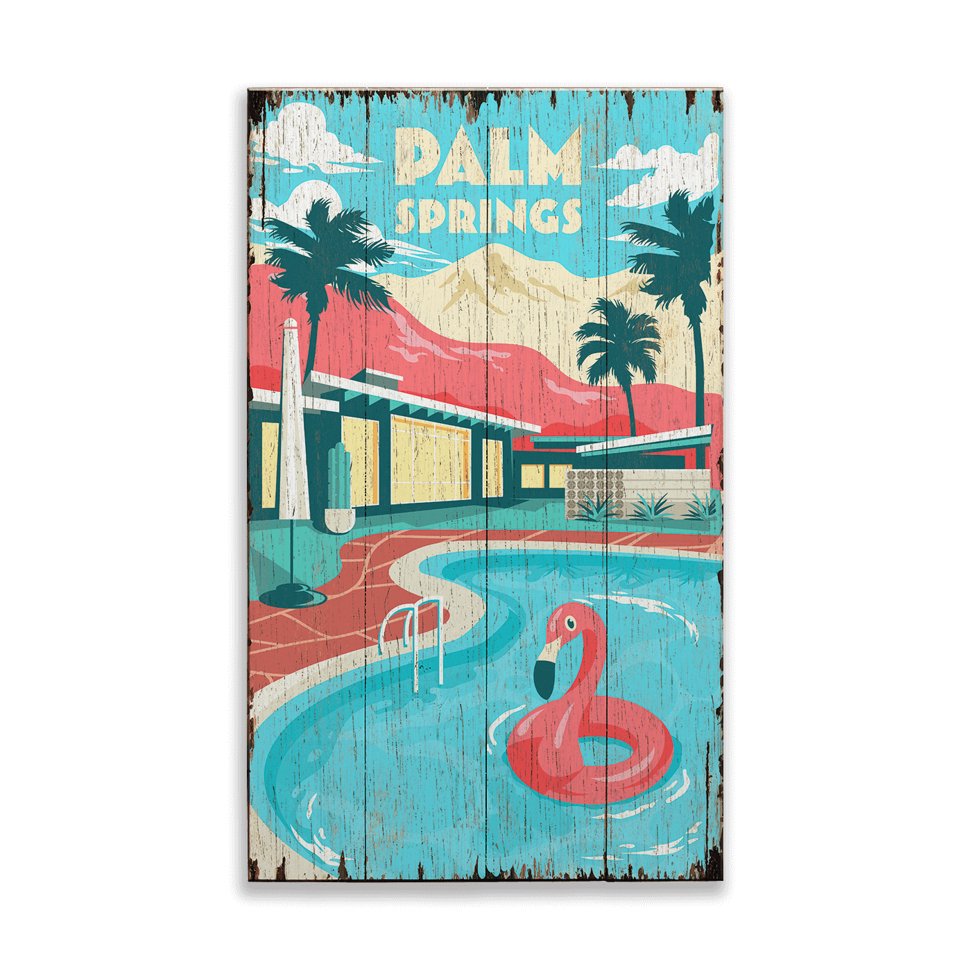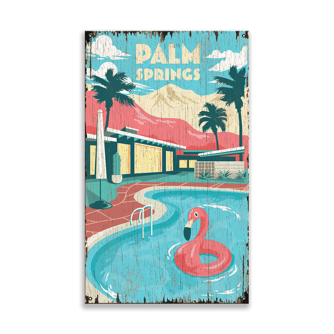 Printed on your choice of distressed wood panel or durable metal, each piece celebrates the spirit of Palm Springs’ golden era, when architecture met leisure and the desert became a canvas for color, creativity, and escape. The weathered texture enhances the vintage appeal, evoking the sun-bleached posters and travel ads of the 1950s that once lured dreamers westward. It’s a piece that feels as if it’s always been part of your home — a whisper of the past brought to vivid life.