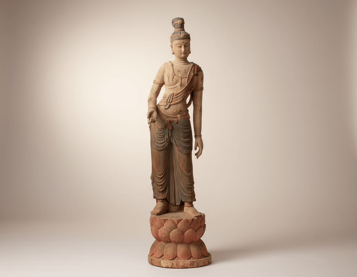 Carved entirely by hand from solid wood, this antique statue once served as an object of veneration in a temple or monastery. The lotus base, symbolic of purity arising from the murky waters of existence, grounds her divine elegance. The artist’s mastery is revealed in the intricate foliate diadem, the carefully layered drapery, and the fine articulation of jewelry — each bead and strand rendered with remarkable care. The restrained palette of natural pigments, worn and faded, suggests centuries of devotion and ritual touch.