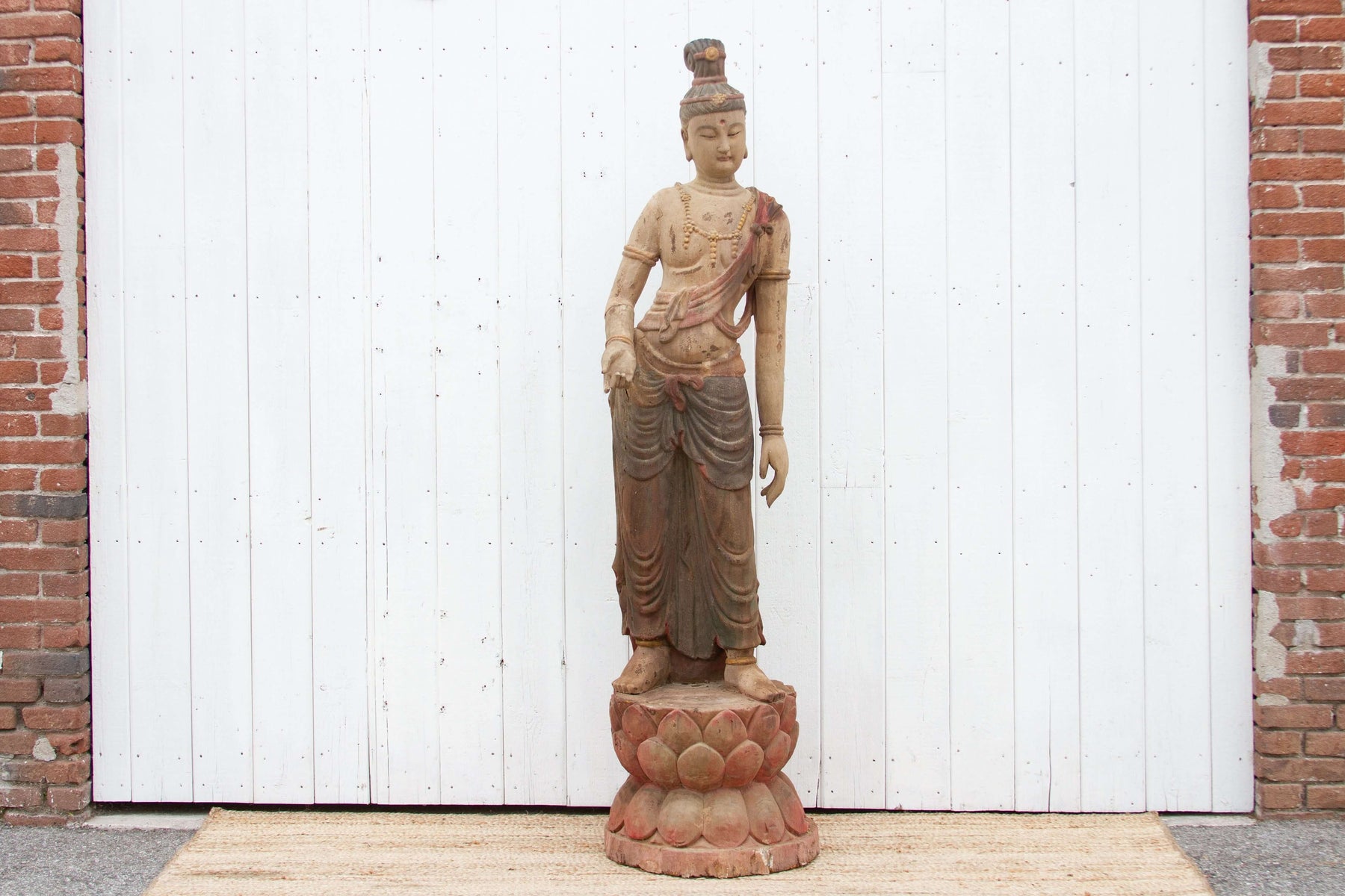 The Rare Standing Antique Guan Yin Buddha Statue on Lotus Base embodies a timeless reverence that transcends centuries — a sculpture carved not merely from wood, but from devotion itself. Originating from the Shanxi province of China in the 18th century, this magnificent figure represents Guan Yin, the Bodhisattva of Compassion and Mercy. Her presence radiates stillness and empathy, an echo of temple chants and flickering lamplight that once filled sacred halls.