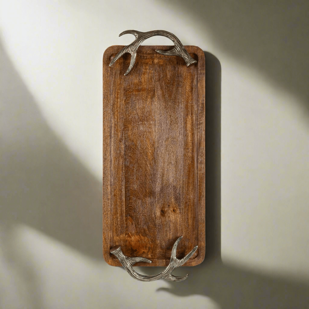 Rustic Antler Mango Wood Serving Tray with Metal Handles