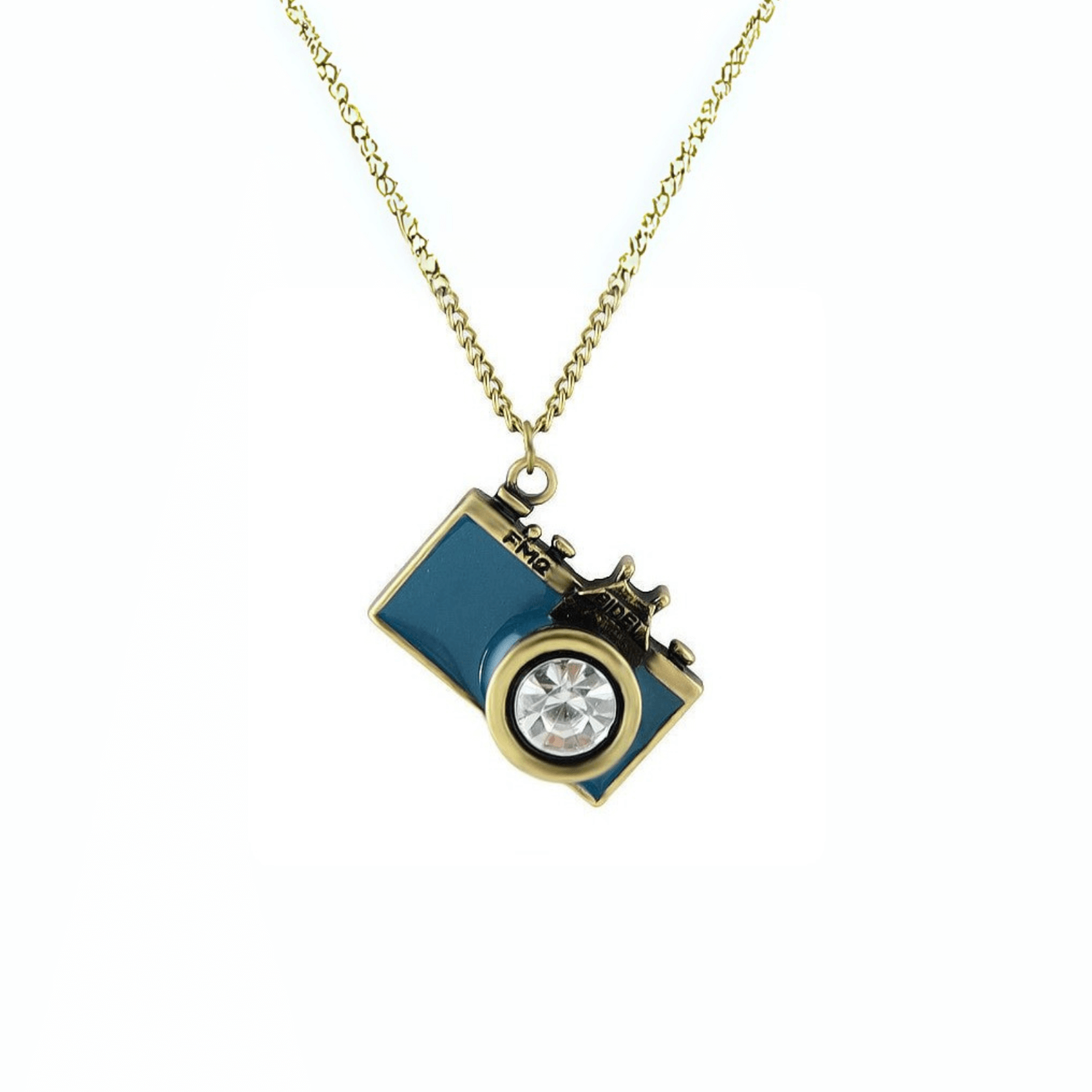 Vintage Camera Pendant Necklace with antique brass finish and teal enamel, featuring a crystal lens, exuding nostalgic charm in jewelry.