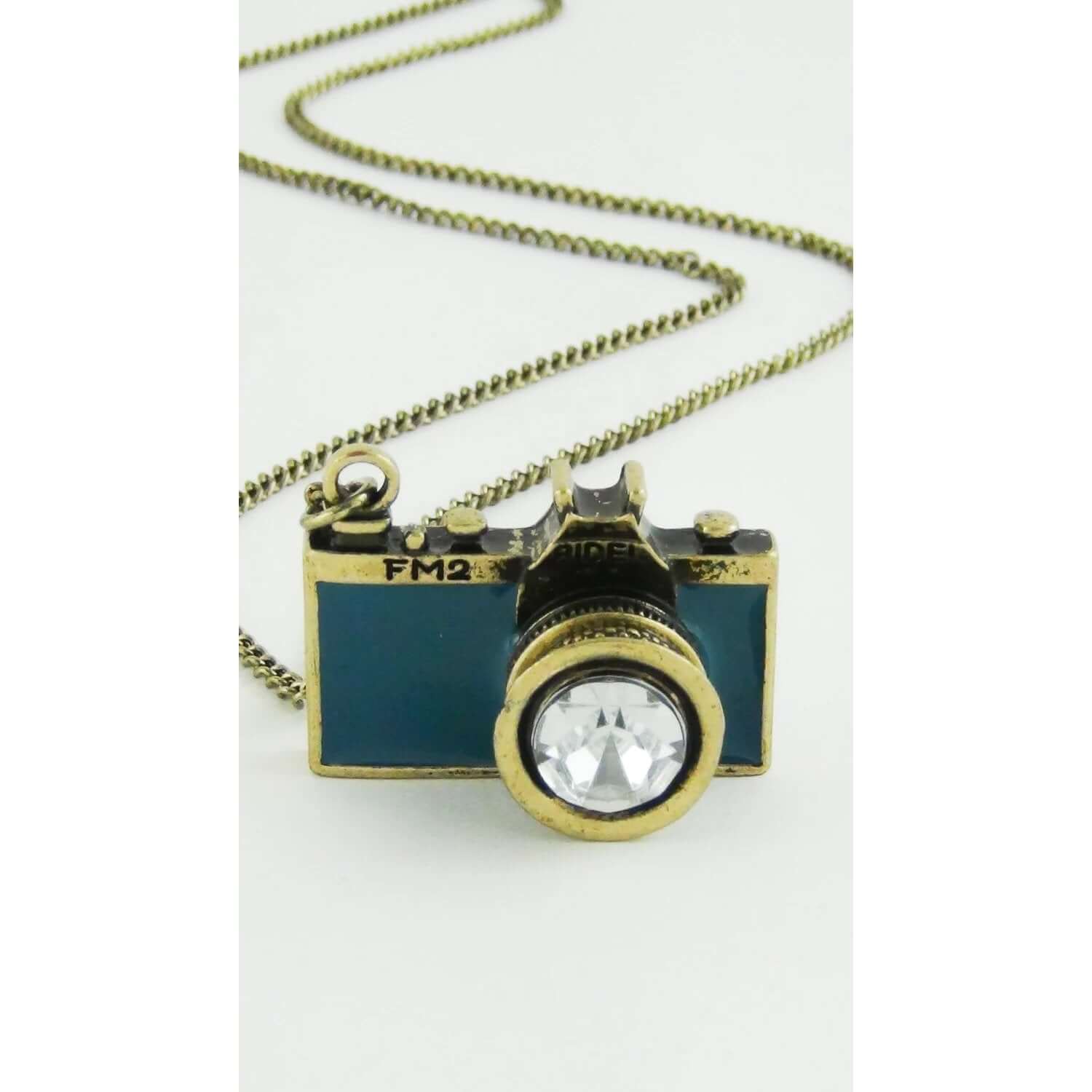 Vintage Camera Pendant Necklace with antique brass and teal enamel design, featuring a sparkling crystal lens.