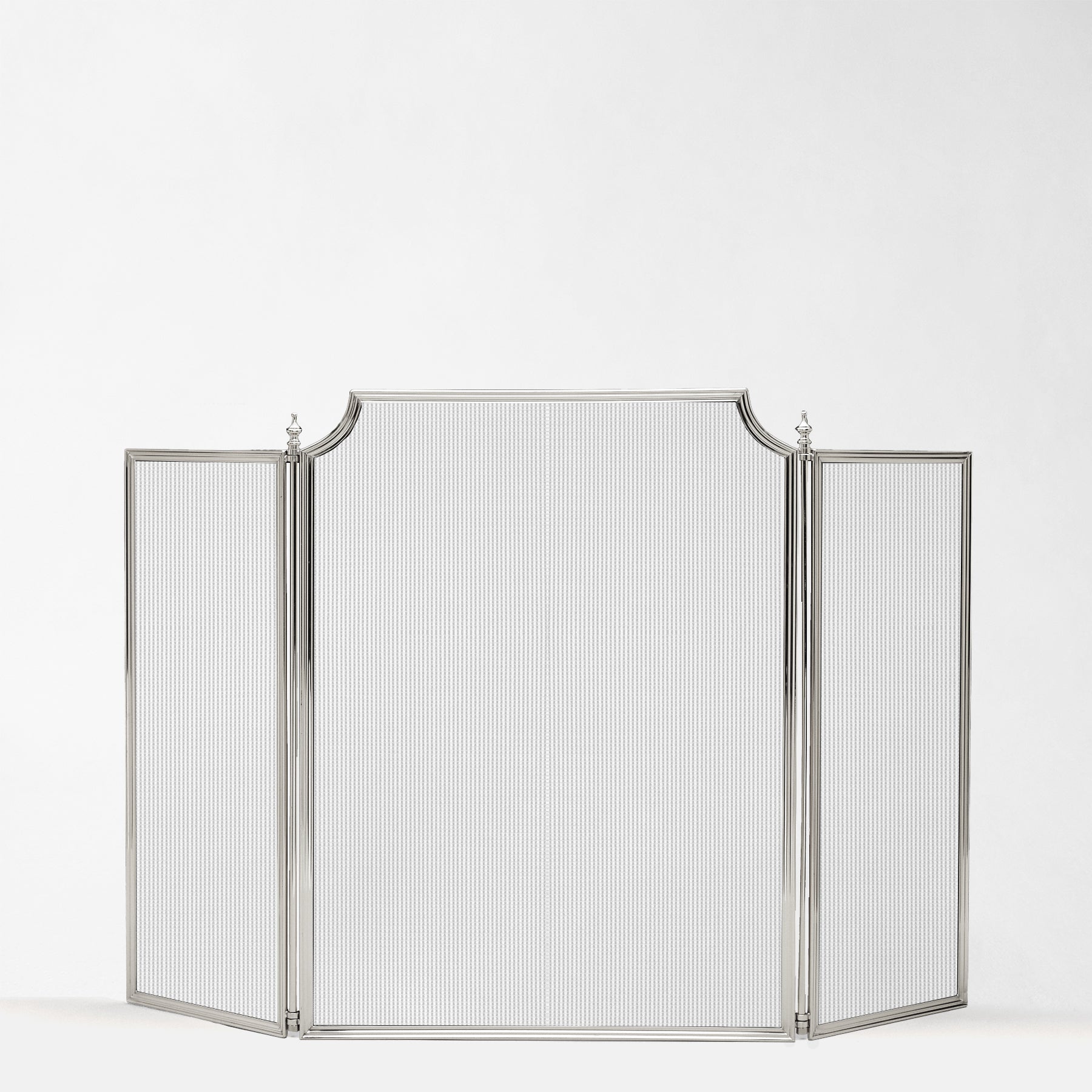 Every detail is considered, from the beveled edging that catches the faintest glint of light to the finial-tipped corners that recall the ornamental language of Italian ironwork. Though resolutely modern in polish, the screen’s proportions speak of another era — one that prized longevity over trend. Its presence suggests evenings of slow conversation, the clink of crystal, and the warmth of companionship around a glowing fire.