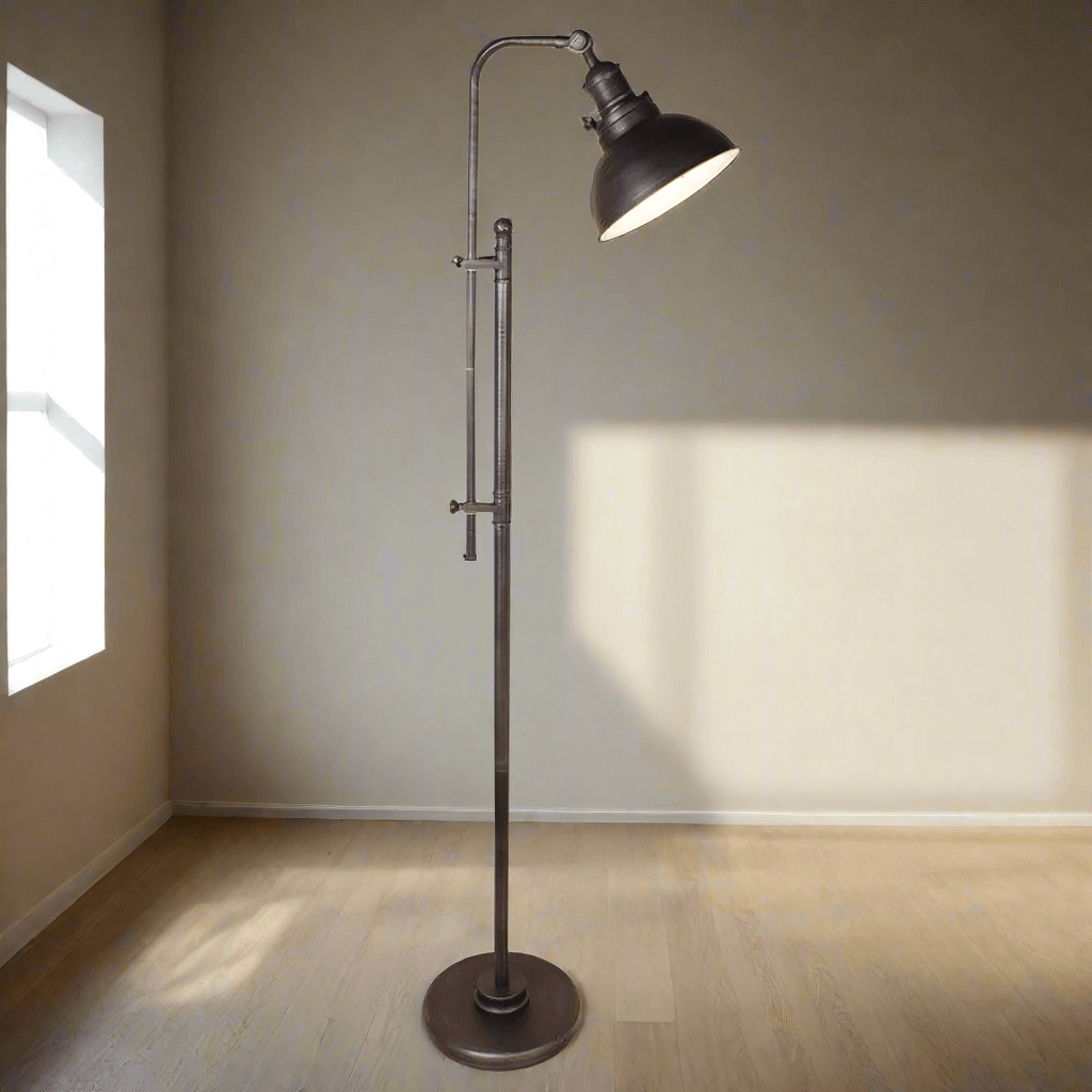 Standing tall at up to 65 inches, its slender metal frame rises with elegant simplicity, while the adjustable arm allows you to direct light exactly where it’s needed — perfect for reading, writing, or illuminating a favorite corner. The dome-shaped shade, crafted in matching distressed metal, recalls the utilitarian lighting of early 20th-century task lamps, when durability and performance came before ornament, yet the result was inadvertently stylish.