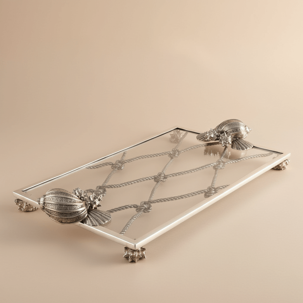 The glass surface is thick and substantial, offering clarity that mirrors sunlight over calm waters. Beneath its transparent sheen, an elegant lattice of pewter rope forms graceful knots — a subtle tribute to the seafaring traditions that inspired it. The frame and feet, sculpted in pure pewter, are adorned with delicate marine creatures: sea snails, scallops, and periwinkles, each rendered with astonishing lifelike precision. Their textures catch the light like treasures drawn from the ocean’s depth, turning a simple act of serving into a small, ceremonial gesture of beauty.